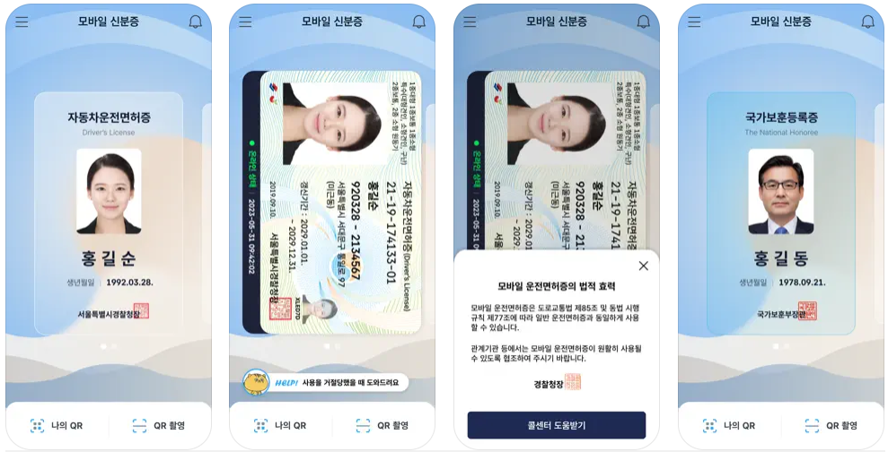 모바일 신분증, 모바일 운전면허증, 모바일 국가보훈등록증, 모바일 재외국민신원확인증은 개인의 스마트폰에 발급되는 신분증으로, 기존의 신분증과 동일한 법적 효력을 지니고 있습니다. 📱✨